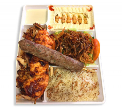 Avec du Homous , moutabel , Salade Fatouch et un choix de Riz ou Boulgour, une galette du pain libanais
