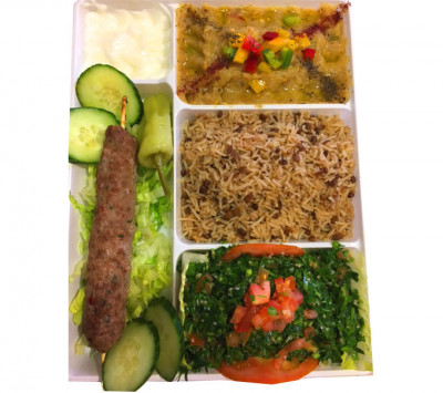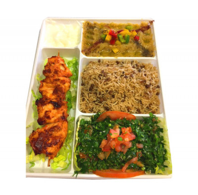 Choisissez 6 mezze au choix et votre viande : brochette cichtaouk /kefta ou chawarma et une galette du pain libanais